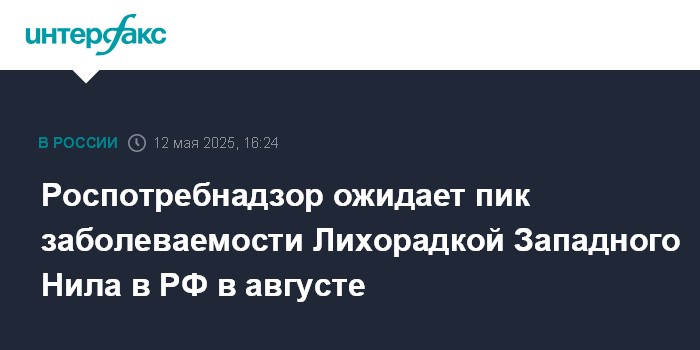 Москва. 12 мая. INTERFAX.RU - Наибольший риск заражения Лихорадкой Западного Нила (ЛЗН) в РФ в этом эпидсезоне ожидается в период с июня по сентябрь, пик заболеваемости прогнозируется в августе, сообщили в столичном управлении Роспотребнадзора.