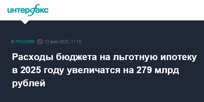 Расходы бюджета на льготную ипотеку в 2025 году увеличатся на 279 млрд рублей