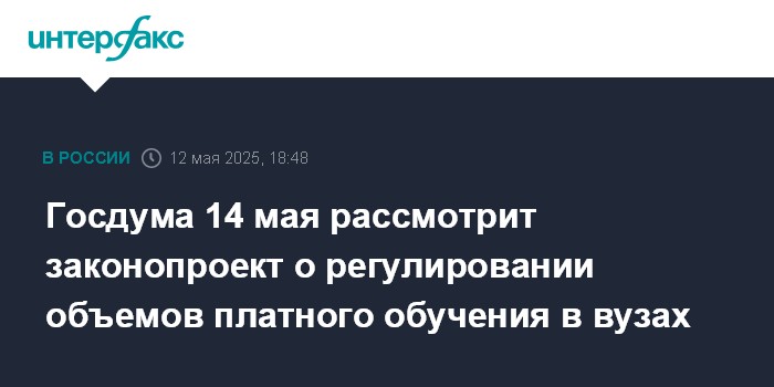 Москва. 12 мая. INTERFAX.RU - Госдума 14 мая рассмотрит законопроект о закреплении за правительством полномочий по регулированию объемов платного приема на обучение в вузы, сообщил журналистам спикер палаты Вячеслав Володин.