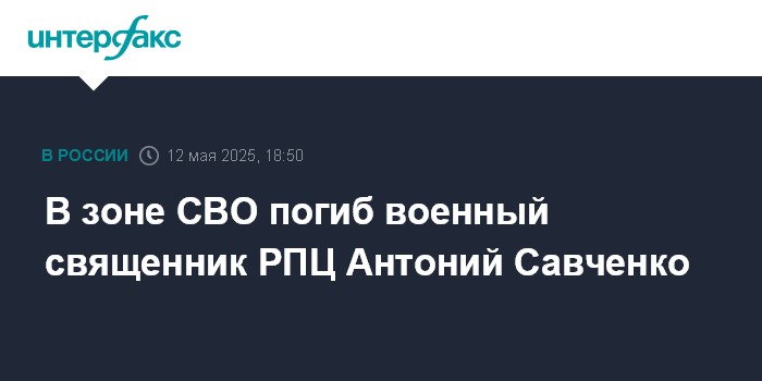 Москва. 12 мая. INTERFAX.RU - Иерей Антоний Савченко, штатный военный священник Русской православной церкви, погиб в понедельник при исполнении пастырских обязанностей в зоне СВО в результате удара HIMARS.