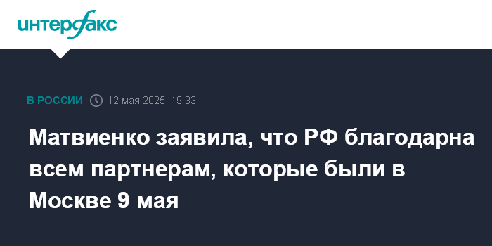 Москва. 12 мая. INTERFAX.RU - Россия благодарна всем государствам, чьи делегации посетили Москву 9 мая, заявила спикер Совета Федерации Валентина Матвиенко.