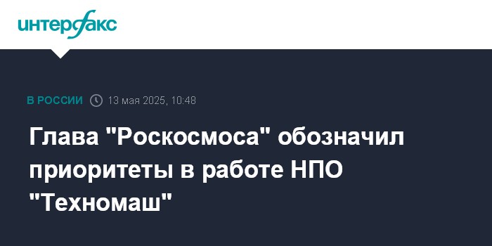 Москва. 13 мая. INTERFAX.RU - Гендиректор "Роскосмоса" Дмитрий Баканов посетил Научно-производственное объединение "Техномаш", где определил приоритетные направления работы предприятия, сообщили в "Роскосмосе".