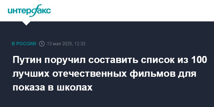Москва. 13 мая. INTERFAX.RU - Президент РФ Владимир Путин поручил Минпросвещения совместно с президентским Советом по культуре и искусству сформировать перечень из 100 лучших советских и российских художественных фильмов для их показа в общеобразовательных организациях.