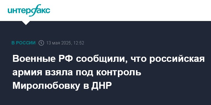 Москва. 13 мая. INTERFAX.RU - Вооружённые силы России взяли под контроль село Миролюбовка в ДНР, сообщает министерство обороны РФ.