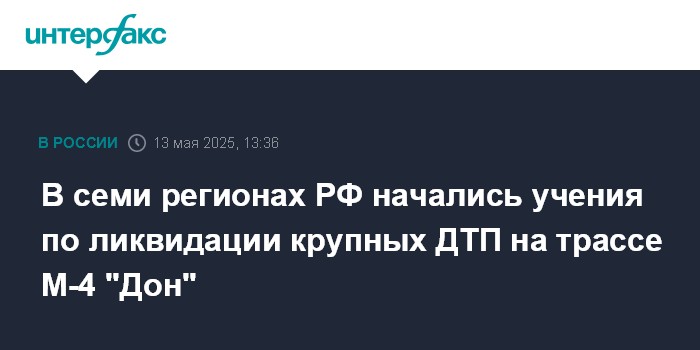 Москва. 13 мая. INTERFAX.RU - Учения по ликвидации масштабных ДТП на всем протяжении федеральной трассы М-4 "Дон" начались в семи регионах России, старт им дал глава МЧС РФ Александр Куренков.