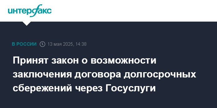 Москва. 13 мая. INTERFAX.RU - Госдума на заседании во вторник приняла в третьем чтении закон, который позволяет гражданам с 1 октября 2025 года заключать договор долгосрочных сбережений (ДДС) напрямую через портал Госуслуг (ЕПГУ), также уточняется процедура господдержки договоров.