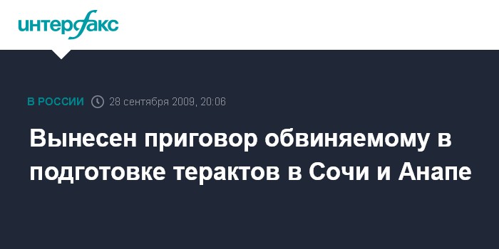 Москва. 28 сентября. ИНТЕРФАКС - Краснодарский краевой суд приговорил россиянина Абдулгани Ганишива к 14 годам лишения свободы за попытку совершения терактов в Сочи и Анапе, говорится в сообщении Генпрокуратуры РФ, размещенном на официальном сайте ведомства.