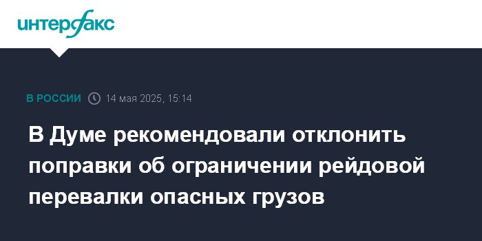 Москва. 14 мая. INTERFAX.RU - Комитет Госдумы по транспорту рекомендовал отклонить правительственный законопроект, который предлагал ввести ограничения на перевалку опасных грузов с судна на судно за границами морских портов.