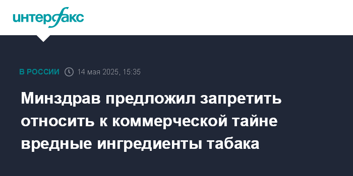 Москва. 14 мая. INTERFAX.RU - Минздрав предлагает не относить к коммерческой тайне данные о наличии и количестве в составе табачных изделий ингредиентов, приводящих к усилению никотиновой зависимости и оказывающих токсическое воздействие. Об этом говорится в законопроекте, опубликованном на портале проектов нормативных правовых актов.
