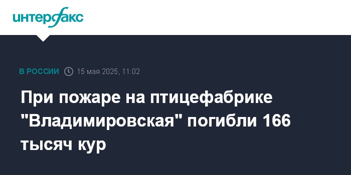 Москва. 15 мая. INTERFAX.RU - Пожар на птицефабрике "Владимировской" в Ахтубинском районе Астраханской области произошел в инкубаторе, по предварительным данным, погибли около 166 тысяч кур, сообщает МЧС.