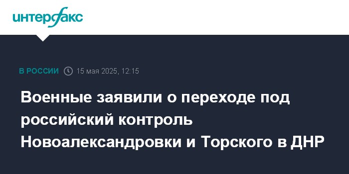 Москва. 15 мая. INTERFAX.RU - Вооруженные силы России взяли под контроль два населённых пункта в ДНР - Новоалександровку и Торское, сообщает министерство обороны РФ.