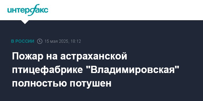 Москва. 15 мая. INTERFAX.RU - Спасатели полностью ликвидировали возгорание на крупной птицефабрике "Владимировская" в Ахтубинском районе Астраханской области, сообщила пресс-служба ГУ МЧС России по региону.