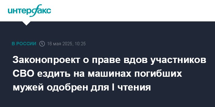 Москва. 16 мая. INTERFAX.RU - Комитет Госдумы по госстроительству и законодательству в пятницу рекомендовал принять в первом чтении законопроект, позволяющий вдовам (вдовцам) участников специальной военной операции использовать транспортные средства, владельцами которых являлись их супруги.