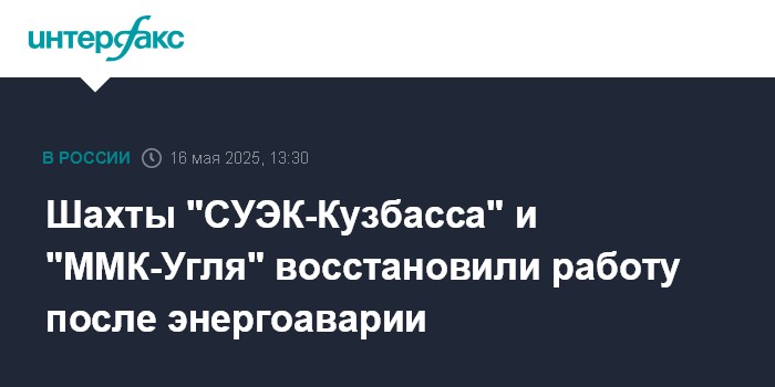 Москва. 16 мая. INTERFAX.RU - Шахты "Комсомолец" и имени Кирова ("СУЭК-Кузбасс") и "Костромовская" ("ММК-Уголь") возобновили работу после энергоаварии, сообщили "Интерфаксу" в компаниях.