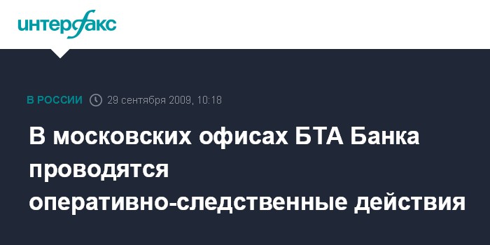 Москва. 29 сентября. INTERFAX.RU – В московских офисах "БТА Банка" проводятся оперативно-следственные действия, сообщили "Интерфаксу" в департаменте экономической безопасности МВД России.