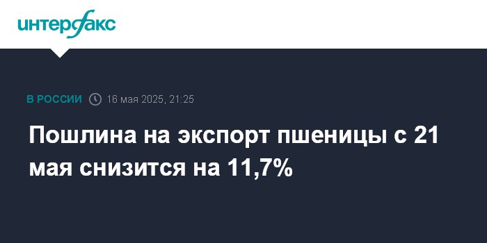 Пошлина на экспорт пшеницы с 21 мая снизится на 11,7%