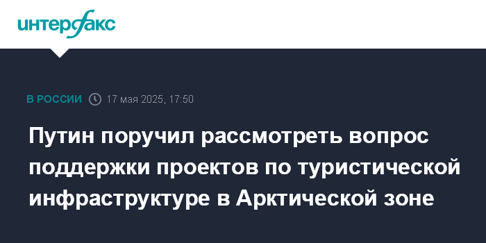 Москва. 17 мая. INTERFAX.RU - Президент России Владимир Путин поручил правительству совместно с властями регионов, территории которых входят в состав Арктической зоны РФ, рассмотреть вопрос о поддержке проектов по развитию туристической инфраструктуры в этой зоне.