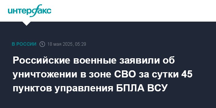Москва. 18 мая. INTERFAX.RU - Российские военнослужащие за минувшие сутки уничтожили 45 пунктов управления беспилотной авиацией украинской армии, заявили в воскресенье представители группировок, действующих в зоне проведения специальной военной операции.