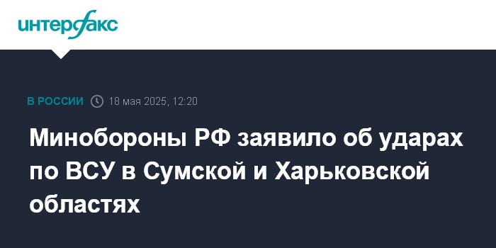 Москва. 18 мая. INTERFAX.RU - Российская армия нанесла удары по украинским силам в Сумской и Харьковской областях, продвинулась на нескольких направлениях спецоперации, заявило Минобороны РФ в воскресенье.