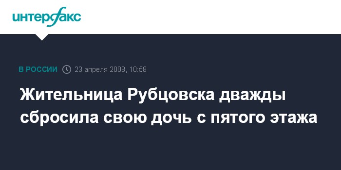 Москва. 23 апреля. INTERFAX.RU - В Алтайском крае женщина сбросила с пятого этажа свою семилетнюю дочь, а затем выбросилась сама.