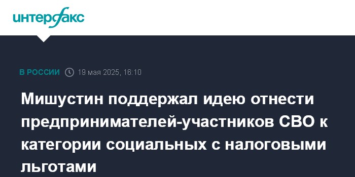 Москва. 19 мая. INTERFAX.RU - Премьер-министр РФ Михаил Мишустин поддержал идею отнести предпринимателей, вернувшихся со специальной военной операции, к категории социальных и наделить их соответствующими льготами по налогообложению.