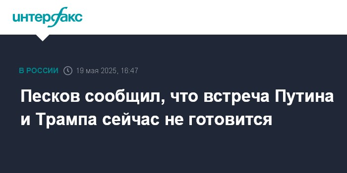 Москва. 19 мая. INTERFAX.RU - Встреча президентов РФ и США Владимира Путина и Дональда Трампа в настоящее время не готовится, заявил пресс-секретарь главы российского государства Дмитрий Песков.