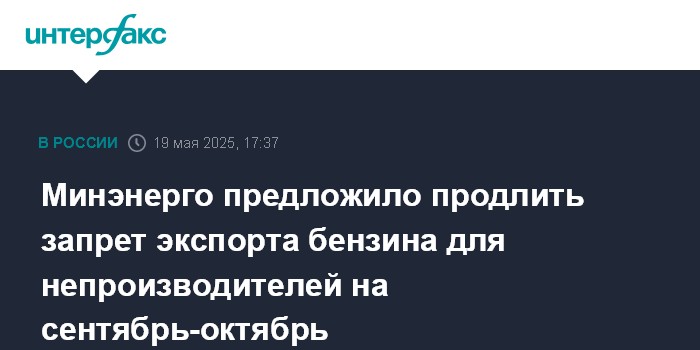 Москва. 19 мая. INTERFAX.RU - Минэнерго предложило продлить запрет экспорта бензина для непроизводителей, действующий до конца августа, еще на сентябрь-октябрь, сообщил журналистам вице-премьер Александр Новак.