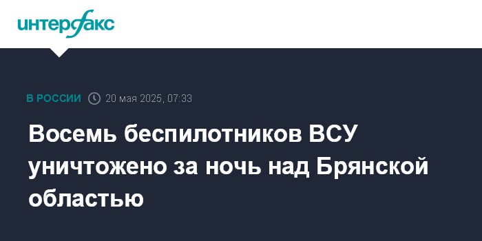 Москва. 20 мая. INTERFAX.RU - Российские военные уничтожили в ночь на вторник восемь украинских беспилотников над Брянской областью, сообщили в Минобороны РФ.