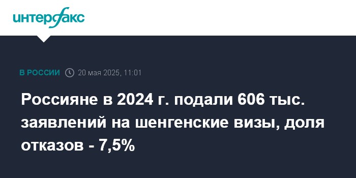 Россияне в 2024 г. подали 606 тыс. заявлений на шенгенские визы, доля отказов - 7,5%