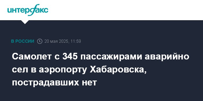 Москва. 20 мая. INTERFAX.RU - Самолет авиакомпании "АйФлай" с 345 пассажирами на борту совершил аварийную посадку в аэропорту Хабаровска во вторник, никто не пострадал, сообщила Дальневосточная транспортная прокуратура.