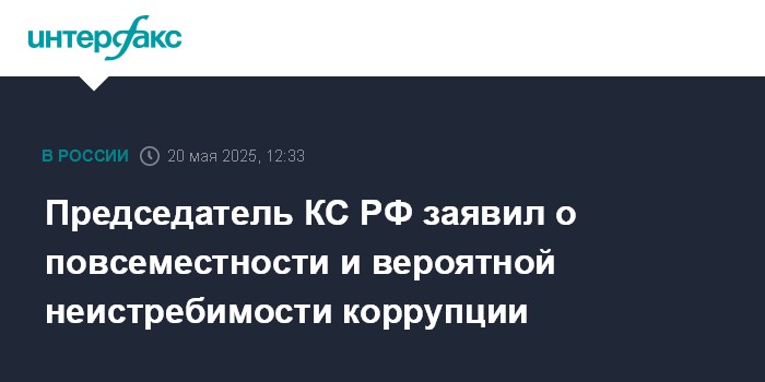 Москва. 20 мая. INTERFAX.RU - Коррупция повсеместна и, вероятно, неистребима, считает председатель Конституционного суда РФ Валерий Зорькин.