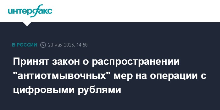 Москва. 20 мая. INTERFAX.RU - Госдума приняла во втором и третьем чтении закон, который предусматривает распространение на операции с цифровыми рублями требований федерального закона №115-Ф3 "О противодействии легализации (отмыванию) доходов, полученных преступным путем, и финансированию терроризма".