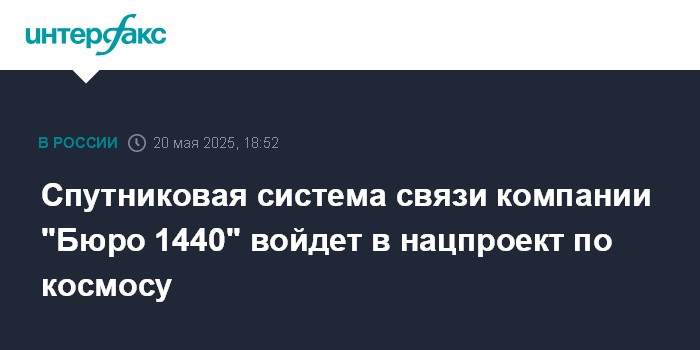 Москва. 20 мая. INTERFAX.RU - Гендиректор "Роскосмоса" Дмитрий Баканов заявил, что спутниковая система российской частной компании "Бюро 1440", а также проекты атомной энергетики войдут в нацпроект по космосу.