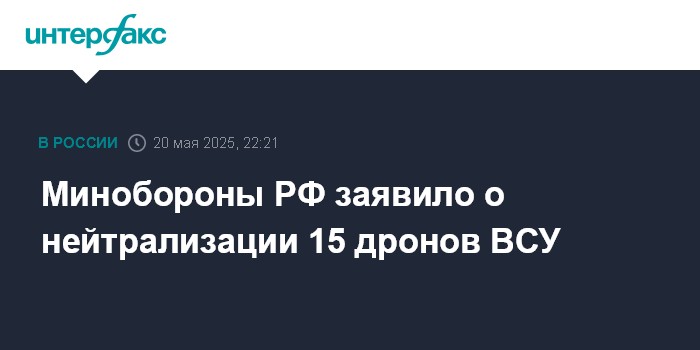 Москва. 20 мая. INTERFAX.RU - Пятнадцать украинских беспилотников сбиты во вторник вечером российскими военными над Орловской, Брянской и Белгородской областями, заявило Минобороны РФ.
