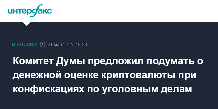 Москва. 21 мая. INTERFAX.RU - Комитет Госдумы по финансовому рынку на заседании в среду поддержал концепцию законопроекта о порядке изъятия цифровой валюты в рамках уголовного процесса, но заявил о необходимости проработать механизм ее денежной оценки.