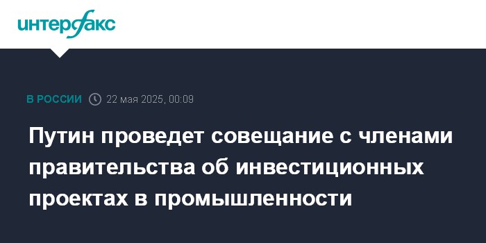 Москва. 22 мая. INTERFAX.RU - Путин проведет совещание с членами правительства РФ о механизмах поддержки инвестиционных проектов в промышленности.
