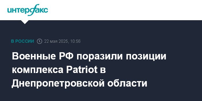 Москва. 22 мая. INTERFAX.RU - Российские военные комплексом "Искандер" поразили позиции ЗРК Patriot в районе населенного пункта Орджоникидзе Днепропетровской области, сообщили в Минобороны РФ.
