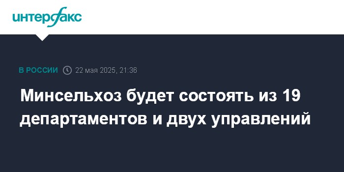 Москва. 22 мая. INTERFAX.RU - Структура Минсельхоза будет состоять из 19 департаментов и двух управлений. Соответствующее постановление правительства подписано 22 мая 2025 года и размещено на официальном портале правовой информации.