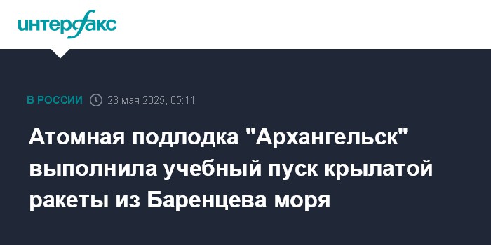 Москва. 23 мая. INTERFAX.RU - Атомная подводная лодка (АПЛ) "Архангельск" в рамках учения в Баренцевом море нанесла удар крылатой ракетой "Калибр" по полигону Чижа в Архангельской области, сообщил в пятницу Северный флот.