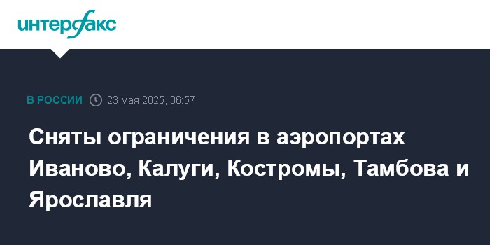 Москва. 23 мая. INTERFAX.RU - Временные ограничения на прием и выпуск воздушных судов (ВС) в аэропортах Иваново, Калуги, Костромы, Тамбова и Ярославля отменены, сообщает в своем телеграм-канале представитель Росавиации Артем Кореняко.