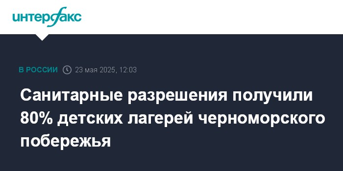 Москва. 23 мая. INTERFAX.RU - Санитарно-эпидемиологические разрешения на работу получили 80% летних оздоровительных детских учреждений Краснодарского края, Анапы, Крыма и Севастополя, при этом лагеря в Анапе и Темрюкском районе не могут использовать пляжи и море. Об этом сообщила глава Роспотребнадзора Анна Попова.