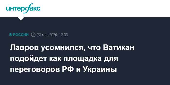 Москва. 23 мая. INTERFAX.RU - Глава МИД РФ Сергей Лавров высказал скептическое отношение к возможности проведения российско-украинских переговоров на территории Ватикана.