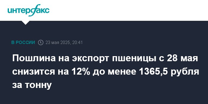 Москва. 23 мая. INTERFAX.RU - Ставка пошлины на экспорт пшеницы из Роммтт с 28 мая составит 1 365,5 рубля против 1 550,3 рубля за тонну неделей ранее, сообщает Минсельхоз. Снижение составляет 12%.