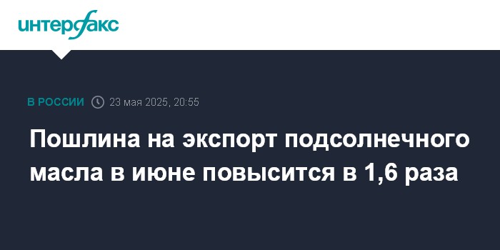 Москва. 23 мая. INTERFAX.RU - Пошлина на экспорт подсолнечного масла из России в июне составит 7 119,8 рубля за тонну против 4,5 тысяч рублей в мае.