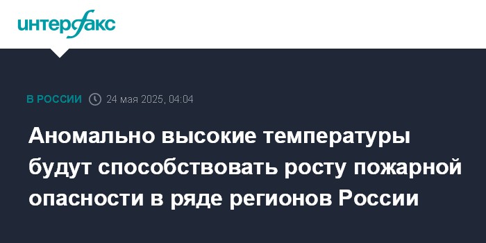 Москва. 24 мая. INTERFAX.RU - Аномально высокие температуры прогнозируются в регионах Северо-Западного, Центрального, Сибирского и Дальневосточного федеральных округов, это будет способствовать нарастанию пожарной опасности, сообщил "Интерфаксу" научный руководитель Гидрометцентра России Роман Вильфанд.
