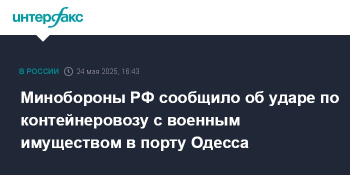 Москва. 24 мая. INTERFAX.RU - Российские военные комплексом "Искандер" нанесли групповой ракетный удар по контейнеровозу с военным имуществом в порту Одесса, на судне находилось около ста контейнеров с грузом военного назначения, заявили в Минобороны РФ в субботу.