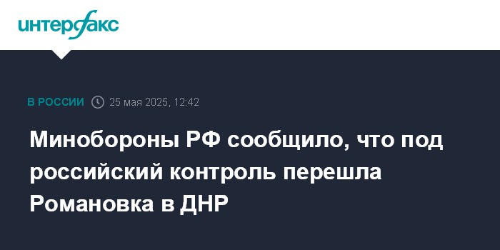 Москва. 25 мая. INTERFAX.RU - Российские войска взяли под контроль Романовку в ДНР, сообщило Минобороны РФ в воскресенье.