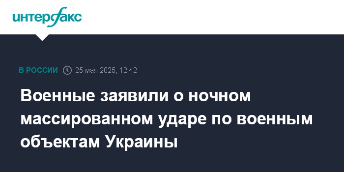 Москва. 25 мая. INTERFAX.RU - Российские военные ночью нанесли массированный удар по предприятиям военно-промышленного комплекса Украины, заявили в Минобороны РФ в воскресенье.