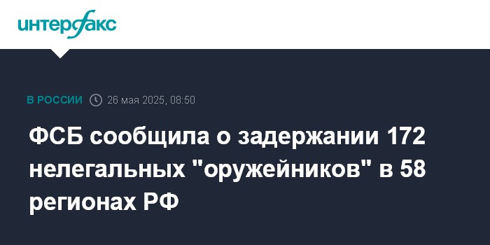 Москва. 26 мая. INTERFAX.RU - В ФСБ сообщили о задержании 172 человек, причастных к незаконному обороту оружия в 58 субъектах РФ, прекращена работа 62 подпольных мастерских по переделке оружия.