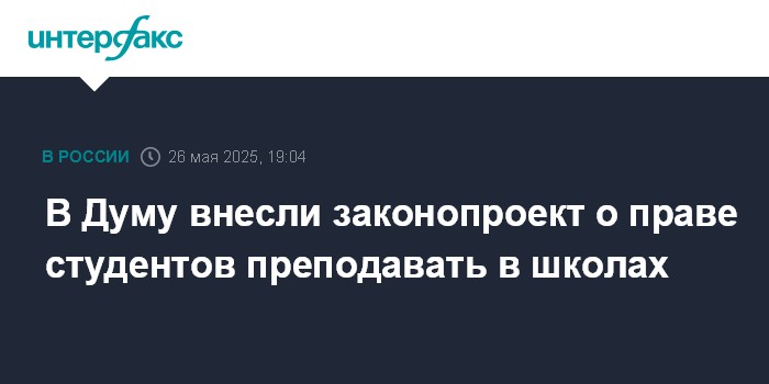 Москва. 26 мая. INTERFAX.RU - В Госдуму внесли законопроект № 926110-8, позволяющий студентам преподавать в школах, внесён в Госдуму, следует из базы данных нижней палаты парламента. Внес документ председатель думского комитета по науке и высшему образованию Сергей Кабышев.